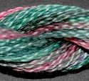 Watercolours is a variegated 3-strand pima cotton. Each strand is roughly the weight of a Pearl #5.